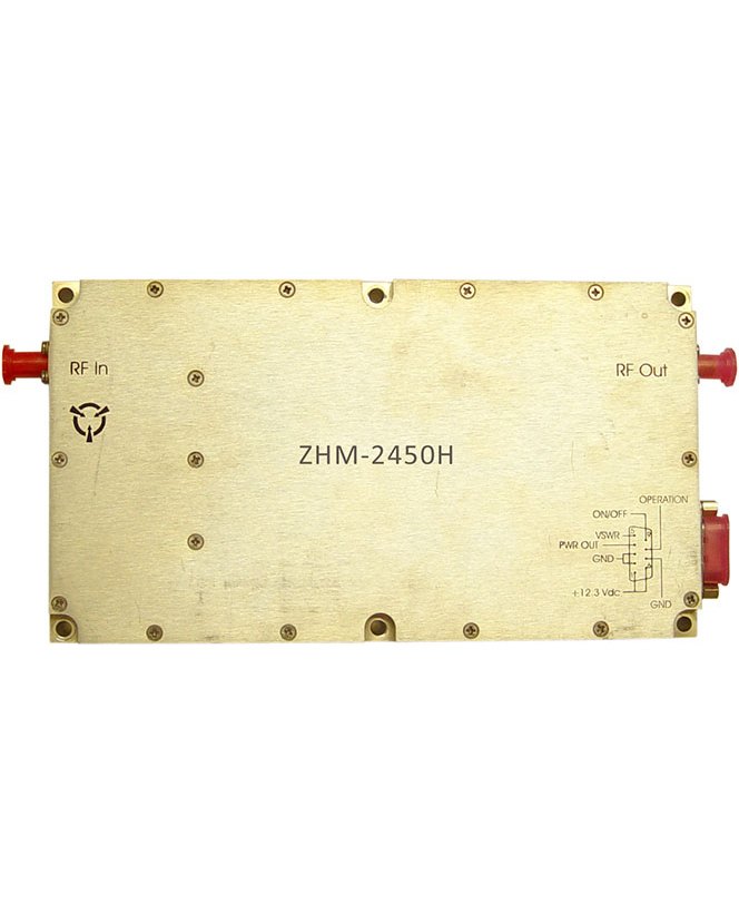 This is a medium power, super broadband RF amplifier that operates from 2350 MHz to 2450 MHz, ideal for broadband military platforms as well as commercial applications because it is robust and offers high power over an extremely large bandwidth with decent power added efficiency. It was designed for broad band communication systems platforms. It is packaged in a modular housing that is approximately 7.5" x 4.1" x 1.0". This amplifier has a typical saturated output power of 25-30 watts at room temperature. Noise figure at room temperature is 8 dB typical. It offers a typical gain of 33 dB with a typical gain flatness of ± 4.2 dB.